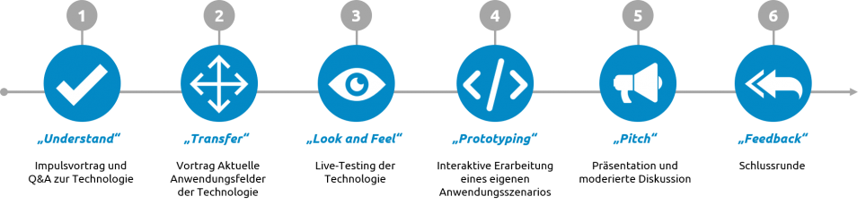 Die TECHschool ist eine Dienstleistung mit dem Ziel Ihnen neue Technologien in Ihrem Unternehmenskontext näher zu bringen. Dabei wird durch Vermittlung der wichtigsten Fakten zunächst ein grundlegendes Verständnis für die Funktionsweise der von Ihnen gewünschten Technologie geschaffen. Anschließend gibt es die Technologie zum Anfassen. Live vor Ort werden Ihre Mitarbeiter diese testen. Durch diese Erfahrungen kann ein Transfer auf die für Ihr Unternehmen relevanten Anwendungsfälle erfolgen, um so die Potentiale von Technologien für Sie zu erkennen.